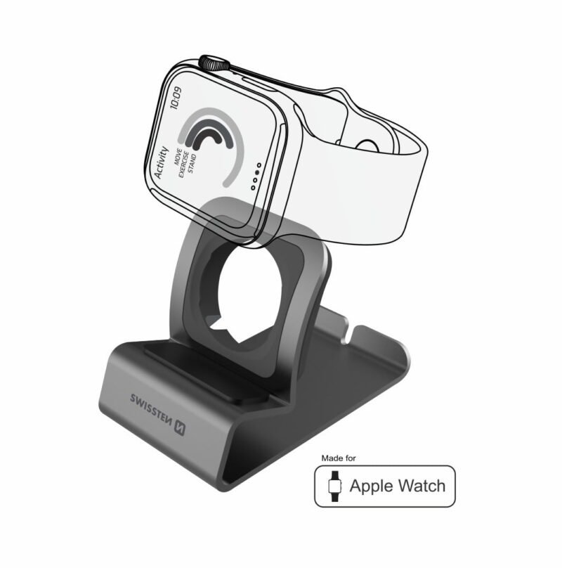 Elegant stand from polished metal for Apple Watch. You can put the wireless charger there. Stand has anti slip pad against scratching of the Watch. Stand is compatible with all Apple Watches 1-6. Packed in Swissten retail pack.