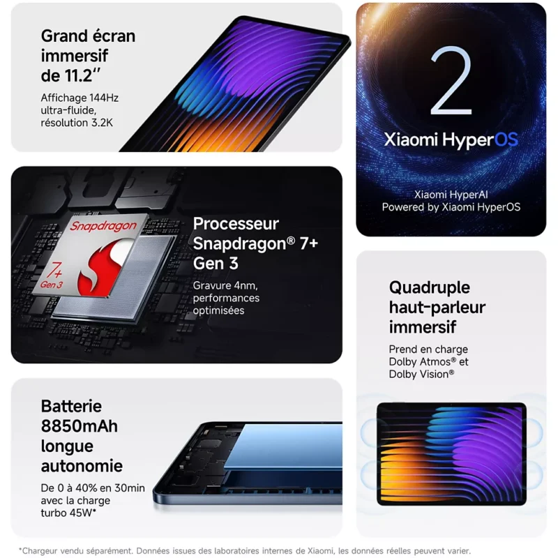 La plateforme mobile Snapdragon 7+ Gen 3 offre des performances rapides et, grâce à la technologie HyperAI, la tablette fonctionne de manière encore plus efficace. Quatre haut-parleurs puissants avec Dolby Atmos offrent une expérience audio immersive. De plus, la batterie de 8850mAh dure très longtemps et vous pouvez la recharger à la vitesse de l’éclair grâce à la charge rapide de 45W. Le Xiaomi Pad 7 fonctionne sous HyperOS, ce qui vous permet de profiter d’une expérience de bureau transparente avec tous vos appareils Xiaomi.