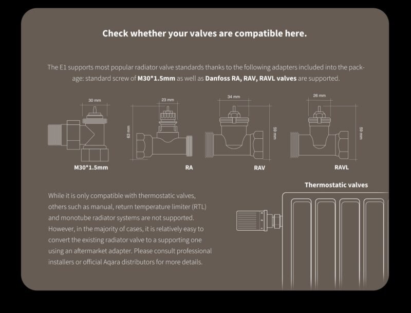 De Aqara Radiatorthermostaat E1 is compatibel met de meeste radiatorsystemen en biedt nauwkeurige temperatuurregeling voor individuele kamers, waardoor optimaal comfort in uw hele huis wordt gegarandeerd. Met zijn strakke en minimalistische ontwerp past hij naadloos in elk interieur en voegt hij een vleugje moderniteit toe aan uw woonruimte.