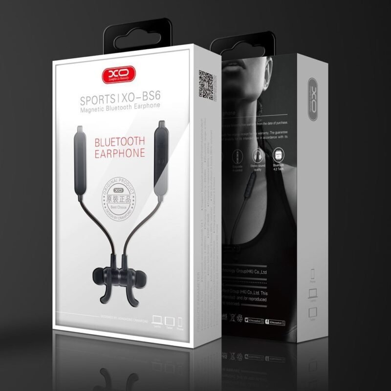 XO Wireless Bluetooth Sport Headphones. Specifications: Model: BS6 – Wearing Type In-ear Material ABS + Aluminium alloy Technical Parameters: Microphone Yes Wired Control Support Bluetooth Version V4.1 Transmission Distance 10m Battery Capacity 100mAh Charging Time (h) 2.5 hours Talk Time(h) 10 hours Standby Time (h) 500 hours